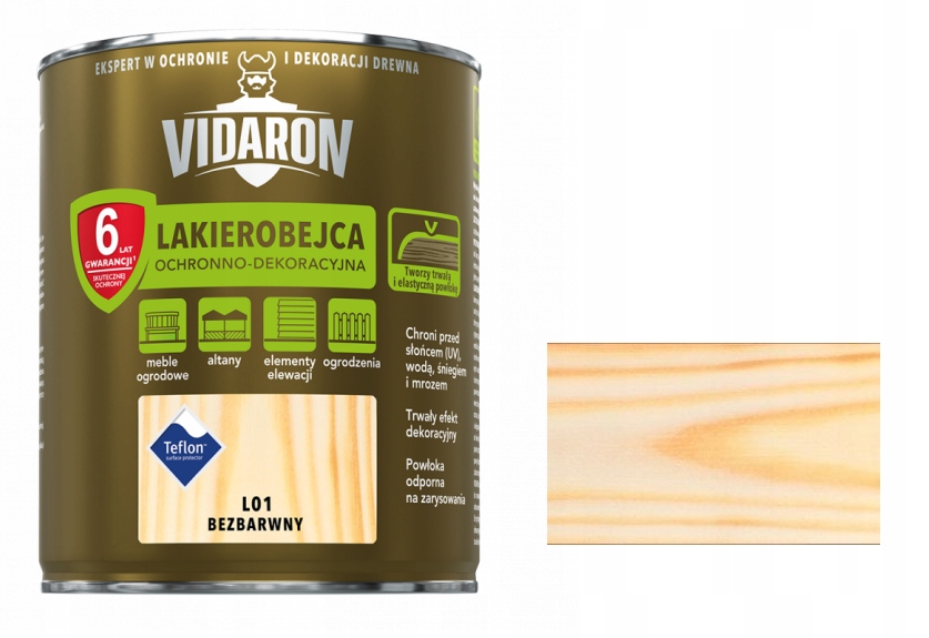 Przeznaczony jest do ochronno‐dekoracyjnego malowania drewna i materiałów drewnopochodnych użytkowanych wewnątrz i na zewnątrz budynków tj. elementów stolarki budowlanej, boazerii, listew dekoracyjnych, mebli, kasetonów, drzwi, okien, altan, płotów, architektury ogrodowej itp. Pod lakierobejcę wymagany jest Vidaron Impregnat Ochronny Gruntujący Bezbarwny jako podkład biologicznie zabezpieczający malowane drewno . Produkt nie jest przeznaczony do lakierowania drewnianych podłóg, schodów, ciągów komunikacyjnych. W przypadku nietypowych zastosowań (np. materiały drewniane stosowane w dekarstwie, egzotyczne gatunki drewna, okładziny korkowe itp.) użycie wyrobu należy skonsultować z Producentem.